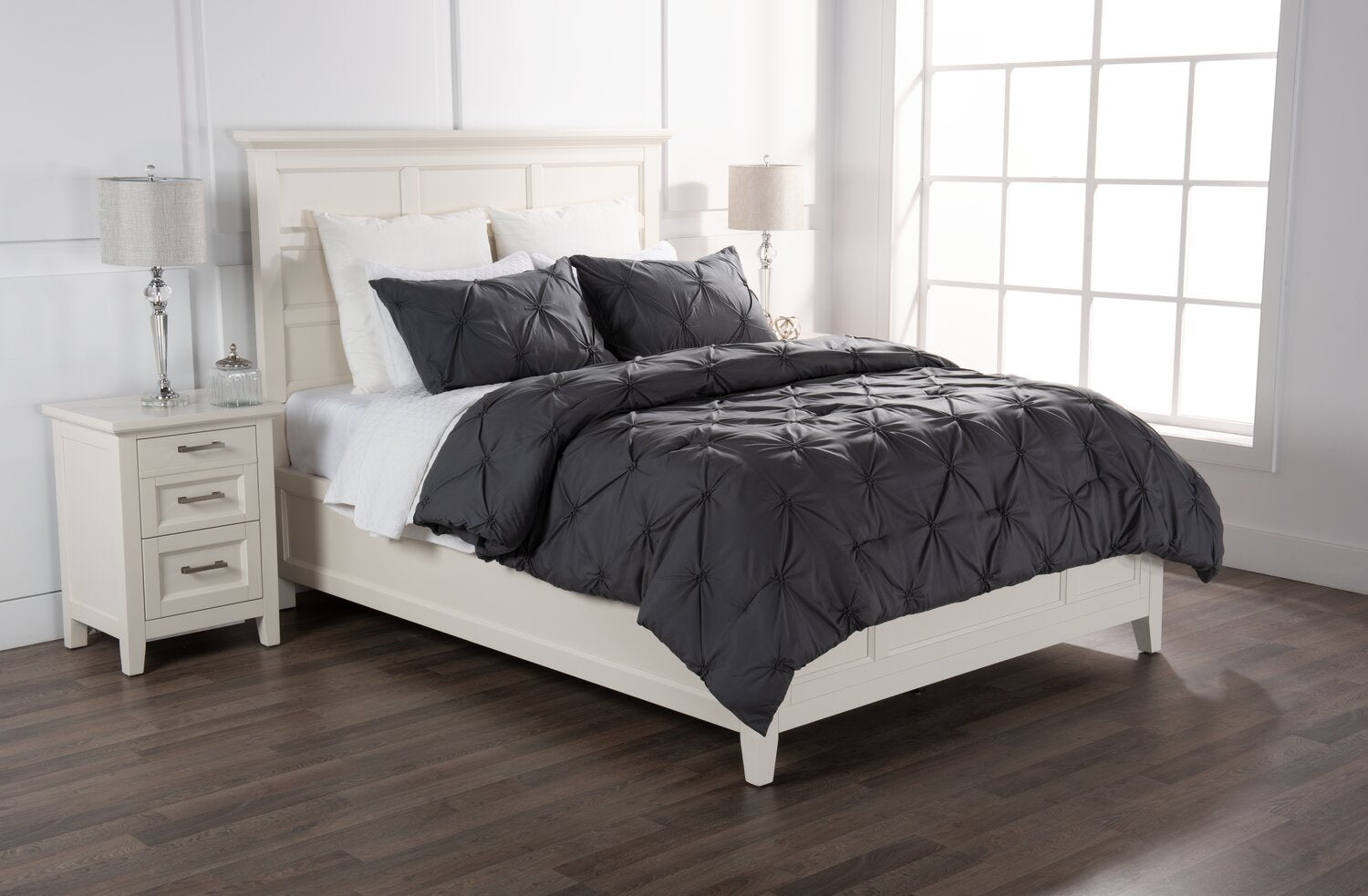 This three-piece Brianna comforter set provides tons of texture and visual interest for any bedroom looking for dramatic effect. Gathered pintuck points across the blanket and pillow shams gives your bed an elegant look. Plus, this technique helps to hold the fibre batting in place inside the comforter. A dark grey hue is the ideal shade to coordinate with your decor, while the soothing microfibre makes this set comforting and durable. Mix this with white or grey sheets for a monochrome effect, or create a bolder look using brightly coloured bedding with decorative cushions.