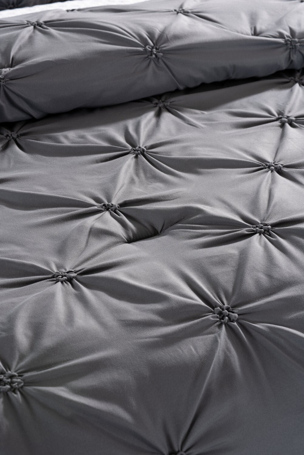 This three-piece Brianna comforter set provides tons of texture and visual interest for any bedroom looking for dramatic effect. Gathered pintuck points across the blanket and pillow shams gives your bed an elegant look. Plus, this technique helps to hold the fibre batting in place inside the comforter. A dark grey hue is the ideal shade to coordinate with your decor, while the soothing microfibre makes this set comforting and durable. Mix this with white or grey sheets for a monochrome effect, or create a bolder look using brightly coloured bedding with decorative cushions.